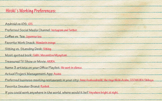 Hiroki’s Working Preferences: